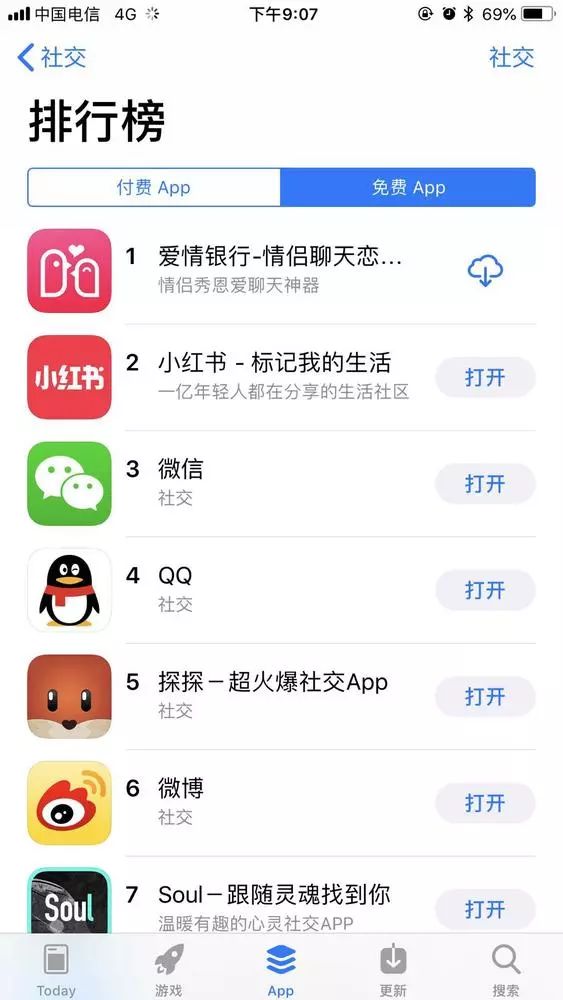 “爱情银行”App在9月8日突升至App Store免费社交榜第一名后,又在9月17日再次冲至榜首。