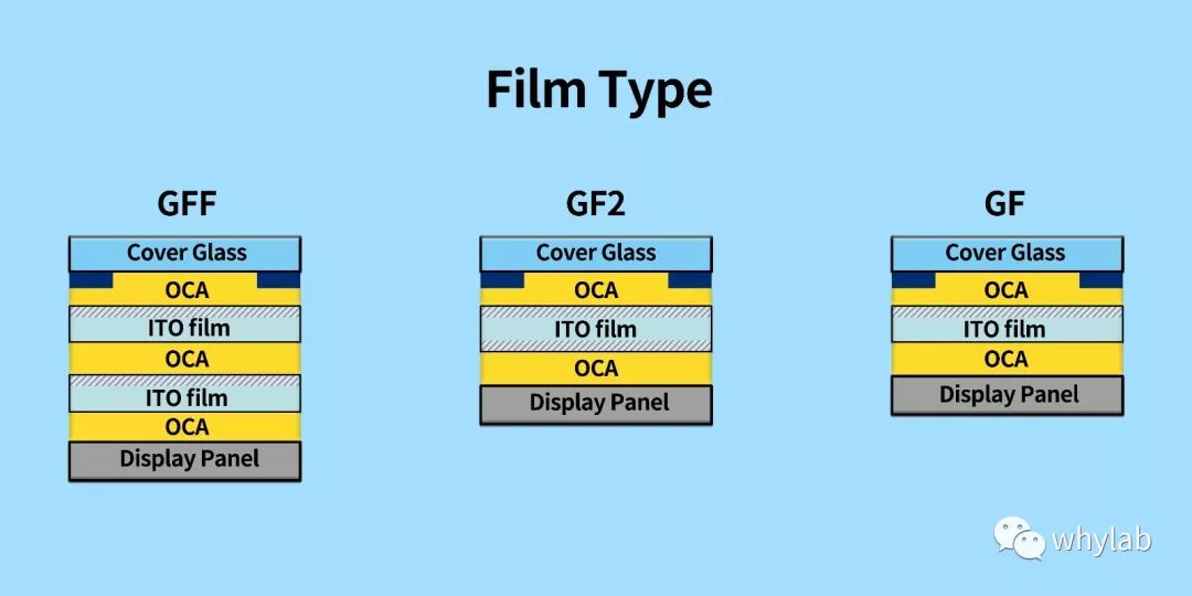 再来说说外挂式薄膜触控方案,有 GF 和 GFF,区别都在图里。