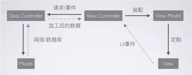 高能预警:这种最基础的方法,实际上是MVC!!!他本身没有解决“Massive View Controller”问题。也就是说为了ViewModel中不依赖于View,必须通过Controller中转,依然会有一堆胶水代码。所以这种解决方案并不是MVVM!!!不是故意给大家挖坑,只是意在提醒大家,阅读文章的时候要举一反三,更不要被一些脏乱差的文章混淆视听。