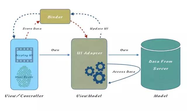 Binder:MVVM的灵魂。可惜在MVVM这几个英文单词中并没有它的一席之地,它的最主要作用是在View和ViewModel之间做了双向数据绑定。如果MVVM没有Binder,那么它与MVC的差异不是很大。