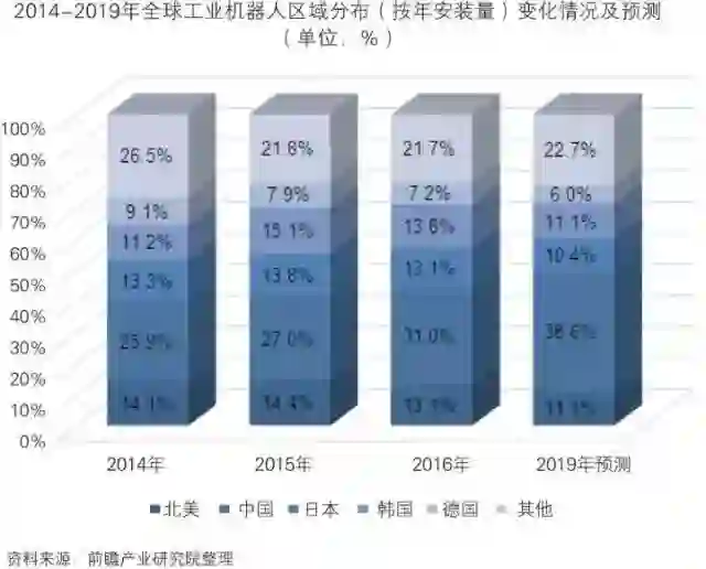 从全球工业机器人的年安装量变化情况来看,据IFR的统计,2016年中国安装量占比提升至31.0%,北美、日本、韩国和德国的安装量比重略有下滑。整体来看,2016年亚太地区依然是工业机器人安装量增量最大的市场。据IFR的预测,到2019年,中国安装量比重将进一步上升至38.6%。