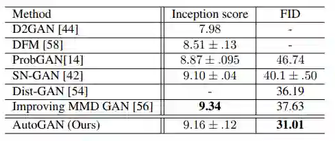 表2:STL-10上无条件图像生成的初始分数和FID分数。AutoGAN在CIFAR-10上使用发现的体系结构