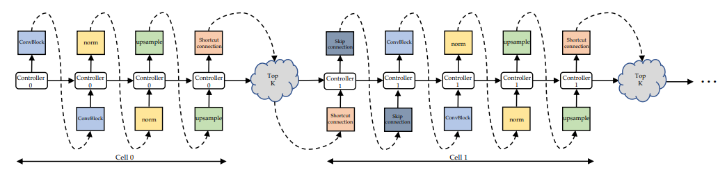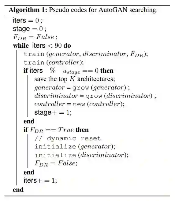 定义搜索空间以捕获GAN架构变化。最重要的是,使用RNN控制器来指导架构搜索。基于参数共享策略,在搜索过程中进一步引入了参数动态重置策略,以提高训练速度。