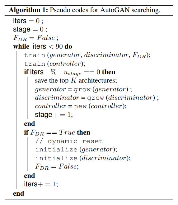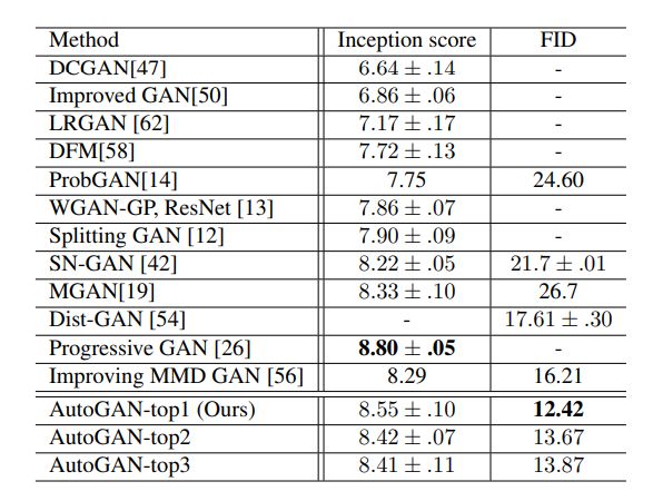 AutoGAN首次尝试将NAS引入GAN。它能够在CIFAR-10和STL-10数据集上识别出高效的架构,从而在当前最先进的人工制作的GAN模型中实现具有竞争力的图像生成结果。
