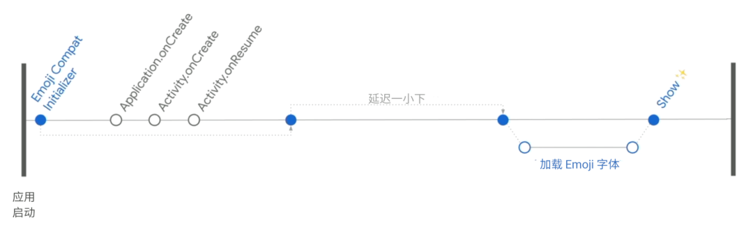 在这次更改中,一大新特性便是 EmojiCompatInitializer,它是一个使用了 androidx.startup 库的初始化程序,在应用启动时会自动配置 EmojiCompat。我们已对该初始化程序的性能进行了大量的调整,对于大多数应用来说使用默认配置已经完全足够,但如果您需要对应用启动做纳秒级别的优化,则可以考虑移除 startup 库和创建线程所带来的消耗。首先,确保先初始化 EmojiCompat,再执行 Activity.onCreate,这可以保证每个 TextView 都能显示新版 Emoji。然后,可以像 EmojiCompatInitializer 一样将 Emoji 字体加载延迟到首屏绘制之后,这样做是因为虽然加载过程是在后台线程中进行的,但它还是执行大量的网络和磁盘 I/O 操作,这些操作会同首屏加载一起抢夺资源。