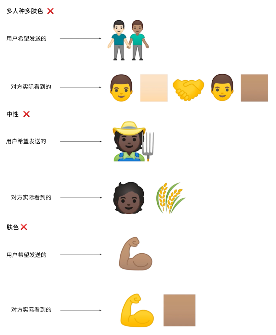 △ Emoji 无法在不同 Android 版本间正确表达多样性和包容性