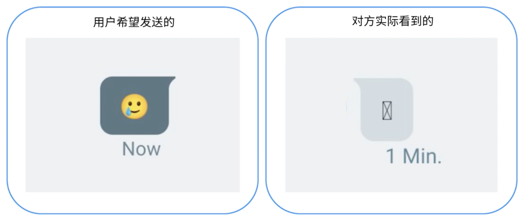 另外根据统计排名,前 100 位的 Emoji 占据了所有用户日常使用 Emoji 总量的 82%,但在约 20% 的情况下,当用户发送一个 Emoji 后,对方看到的却是豆腐块或一张损坏的图像,这种情况直接导致用户无法正确通过 Emoji 来传递自己的本意。如下图所示,用户发送了一张含泪的笑脸,但对方却只收到一个中间有 X 的方块 (我们称其为豆腐块)。