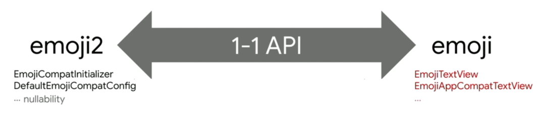 Emoji2 库是 AppCompat 库的一个新的依赖项,虽然它会代替现有的 androidx.emoji 库,但是 API 几乎相同。在此次更新中,我们使用 androidx.startup 添加了新的初始化程序 (EmojiCompatInitializer),添加了新的默认配置,并且全部支持了 nullability 注解。另外,相较于 androidx.emoji,我们还删除了一些在使用 AppCompat 时不再需要的 TextView 子类,这使得在 RA 之后节省了约 14KB 的大小。