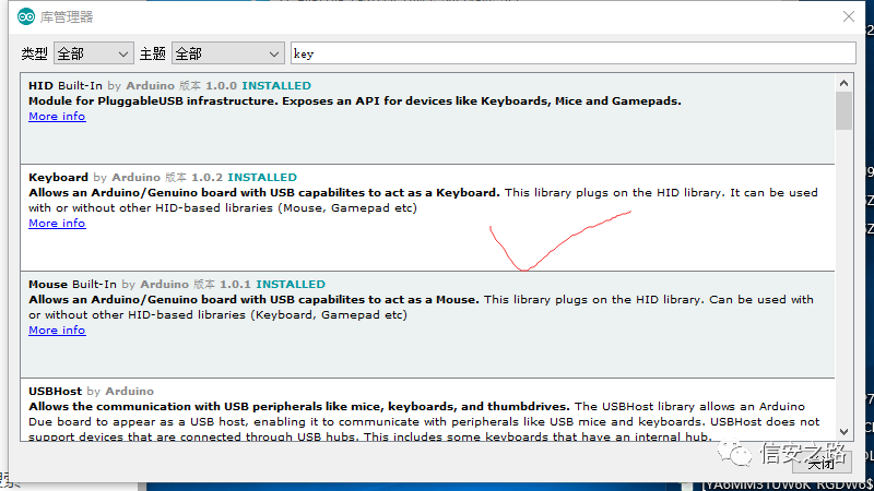 当你上传的时候会发现上传错误,原因是你没有这个 keyboard 的库文件,我们再去项目-加载库-添加库-搜索 keyboard 安装就可以了