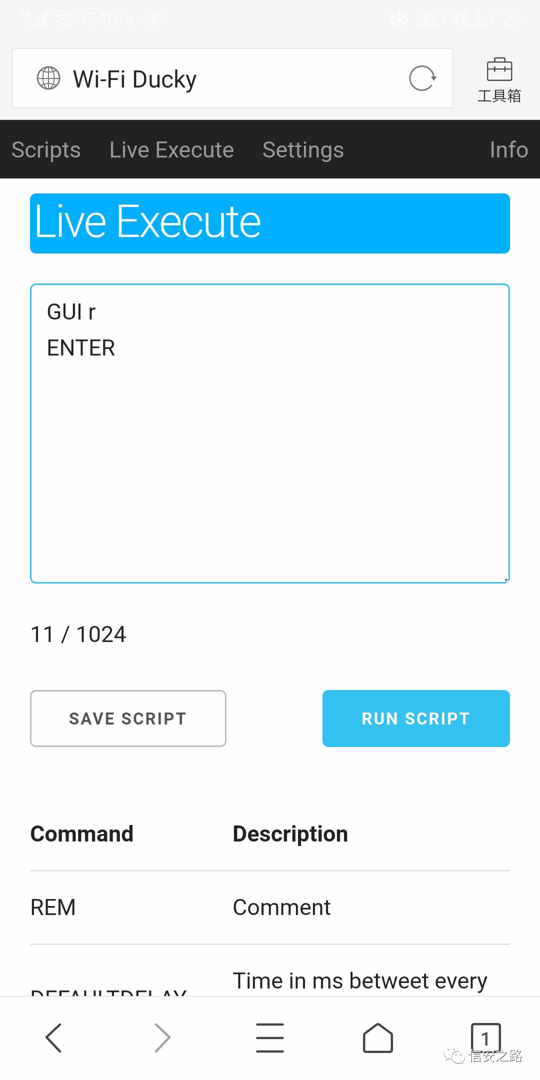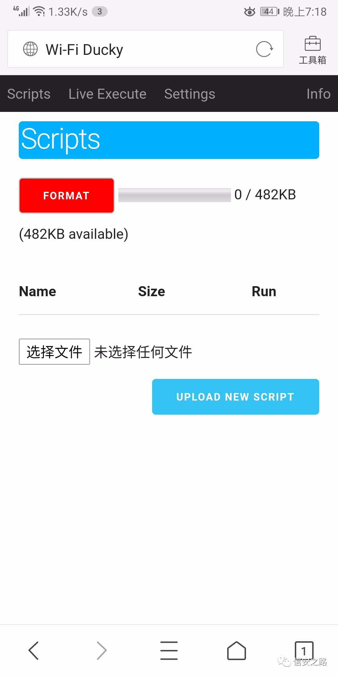 当我们插上电源的时候 ESP8266 会发射出一个叫做 WIFI DUCK 的 SSID 连接密码是 quackquack,连接上了以后打开浏览器登入后台 192.168.4.1 中进行控制我们会发现有三个界面第一个的界面就是 badusb 的脚本界面,这控制界面是给你提前写好的脚本进行上传用的总共能上传 482KB,