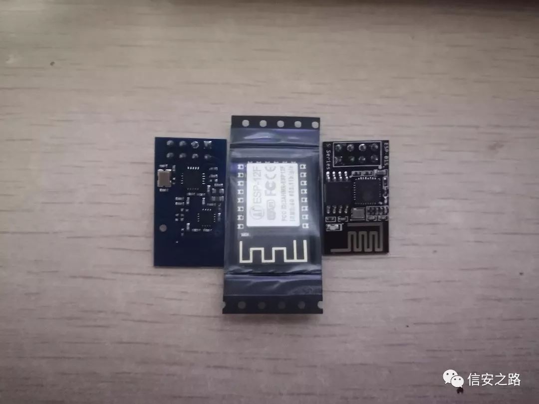 原因也是非常简单(我没有买 5v 转 3.3v 的板子)从小白的角度出发来说用 ESP-12F 的话你还需要买一个电压转换板这样就加大了你的焊接难度而 NodeMCU 所有的脚针都给你引出来了这样你就非常的好用杜邦线进行连接。(从左往右依次是 NRF24L01,ESP-12F,ESP-01S)
