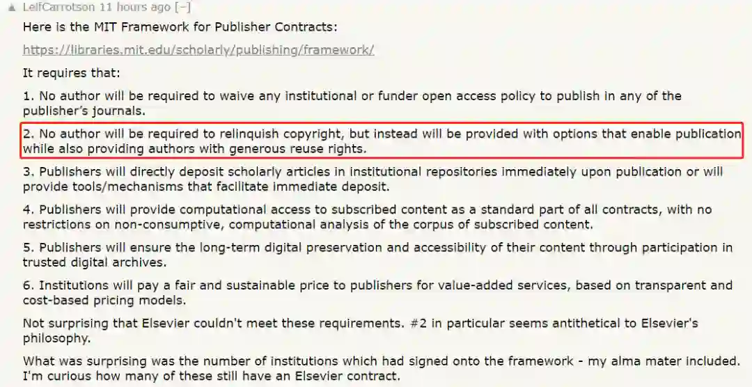 如今,著名学术机构 MIT 与爱思唯尔的谈判也宣告破裂。这是否意味着开放获取运动(OA)将走向新高潮?爱思唯尔等出版机构是否能够适当放松限制,为学术界知识的流通做出应有的贡献呢? 网友:分道扬镳意料之中,解决之路依旧漫长 MIT 与爱思唯尔的决裂在社交网络上引起了激烈谈论,有网友贴出了《MIT 有关出版商合约的指导性框架》的六项核心原则,认为爱思唯尔毫无疑问无法达到这些要求,特别是第 2 条中「出版商不应要求作者放弃文章版权,相反应为作者提供一些选项,以支持文章发表并保证文章的重复使用权」,而这与爱思唯尔的经营理念背道而驰。 这样看来,《MIT 有关出版商合约的指导性框架》与爱思唯尔的经营理念存在内在不一致性,分道扬镳也是意料之中的事情。