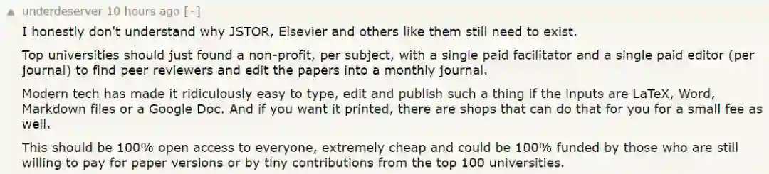 不过也有网友发出「灵魂一问」:实在不理解为什么 JSTOR、爱思唯尔以及其他类似学术出版机构能够长久存在下去。 ta 还提出建议,顶级大学应针对每个学科提供非盈利性出版服务,每个期刊分别设立一名付费服务商和付费编辑,然后聘请同行审稿人,最后将论文编辑成月刊发表。