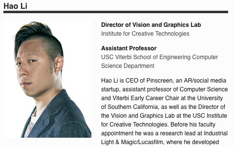 被起诉的这位华裔老板名叫黎颢(Hao Li),看履历完全称得上“精英”:现任南加州大学(USC)计算机科学助理教授,也是该校视觉与图形实验室主任;2009博士在读时参与开发了首款无标记的性能驱动性面部动画识别系统,并因此获得当年ACM SIGGRAPH最佳论文奖;2013年当选 MIT TR35(《麻省理工科技评论》杂志评选的 35 位 35 岁以下科技创新人物”,2015年获谷歌学院研究奖。