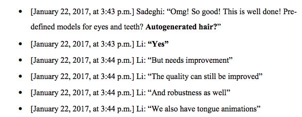 2017年1月22日,在Sadeghi签署加入Pinscreen的合同之前,黎颢通过Facebook消息以书面形式向他发送了两个据称自动生成的虚拟形象的例子。 Sadeghi特别询问是否自动生成了头像,黎颢明确回答“是”。