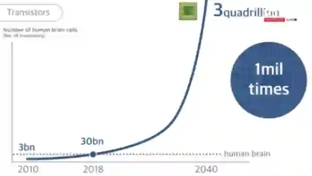 如果这个估计前后或许有几年误差,这并不要紧。重点是,人类的大脑在2000年前,在4000年前,神经元的数量一直没有变过,和现在是一样的。我们大脑的“硬件系统”从未得到过改良,然而,芯片里的晶体管的数量在未来30年将成百万倍上升。