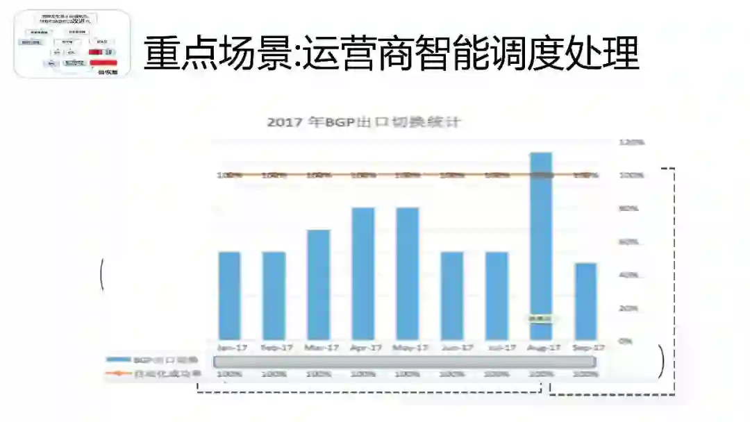 从图中可以看出,自从上线了自动化场景后,BGP出口自动化切换的成功率是100%,每自动化切换一次都意味着系统帮助我们规避了一起故障。