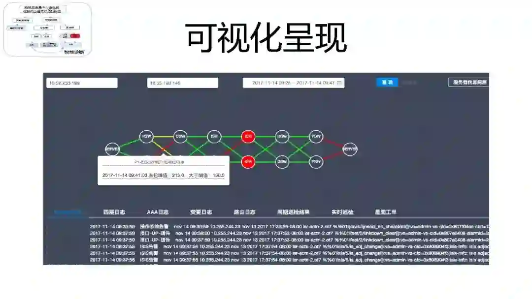 在实际中我们经常会面临这样一个问题,某个地方丢包比较高或者两个点之间应用出现了严重的超时,究竟是怎么引起的?如果用人工的方式进行定位,首先要解决如何了解两个点之间端到端网络拓扑是怎样一种结构。拓扑上现在有故障在发生吗?如果有,这些故障设备究竟产生了哪些日志、过程中是否有变更在进行?如果已经知道是哪些设备为可疑对象,可能接下来对设备进一步下发命令、对数据做深入诊断,整个过程大概需要1-2小时。