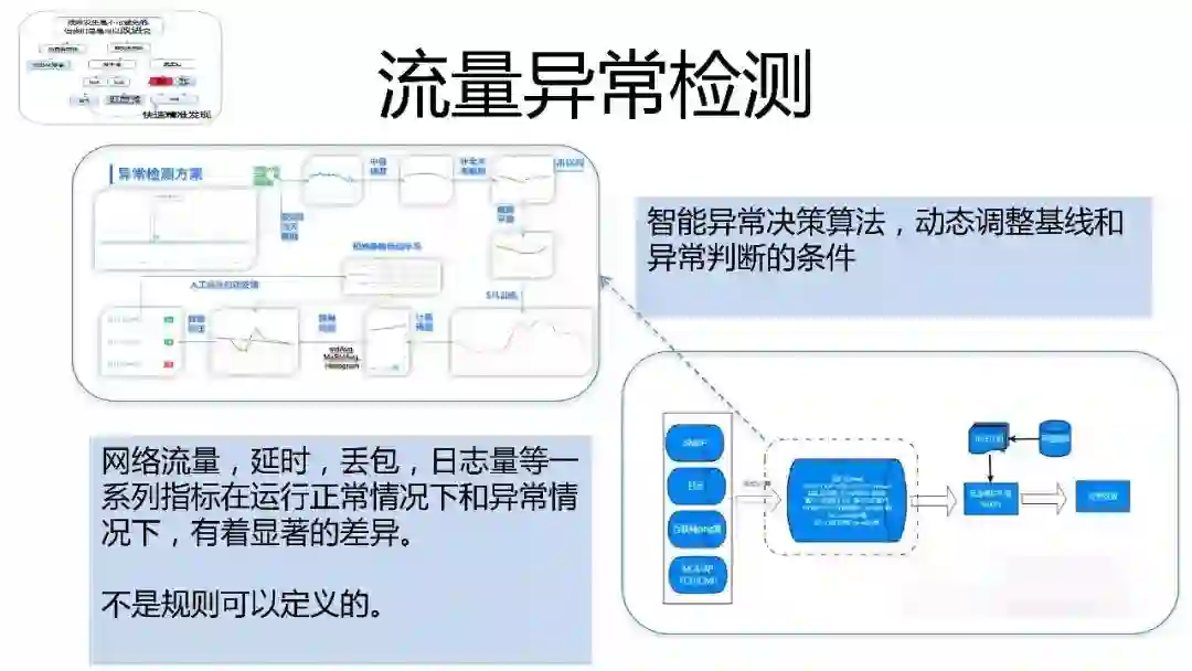 为什么我们需要专门的模块来做异常流量的识别?因为某些数据不能通过传统方式确认其是否异常,如延迟、日志量、网络流量,这个数据在某个时段是正常的,但在另一个时段里是异常的。流量异常识别模块解决了如何构建一种智能决策算法,根据时间点和场景动态调整对应基线的问题。