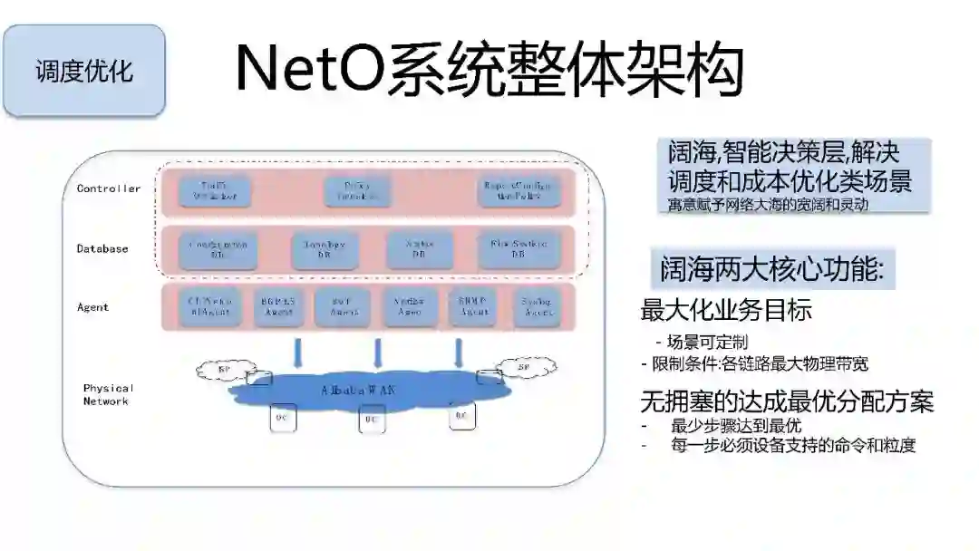 技术层面。我们希望每次网络路径都是最优的。传统网络基本基于Metric机制确定最短路径。对于阿里这张具有多样链路的网络,交易链路对网络的延迟极其敏感,大数据需要很大的带宽,需要更多可达路径帮助快速进行数据的传输。