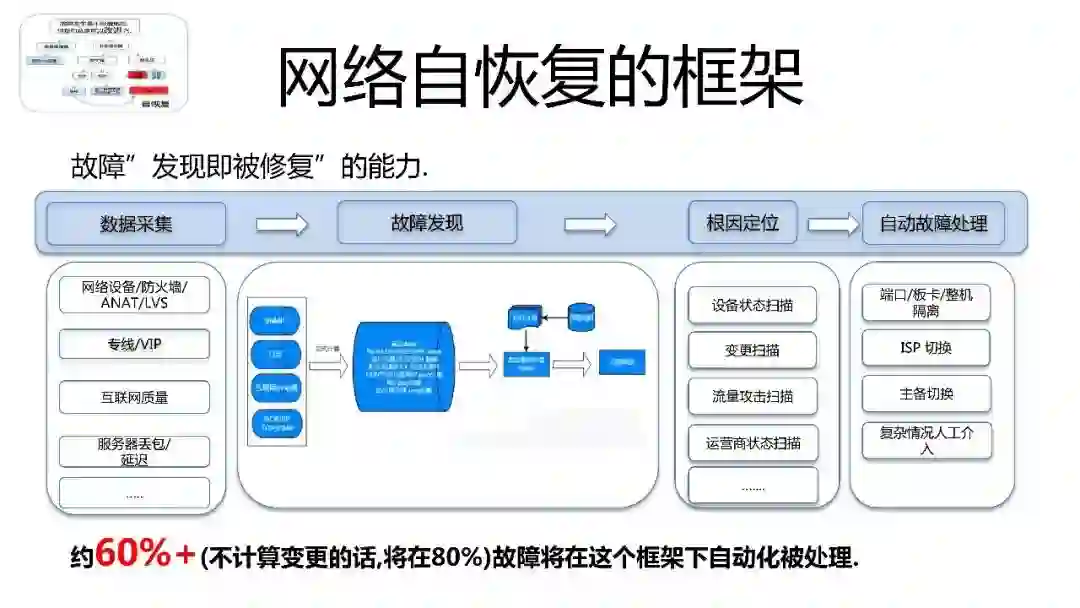 后续会逐步加入更多的场景。随着场景的增多,到目前我们已经有60%以上的风险隐患实现了自动化的处理,大大降低了故障问题处理的时长,实现了真正的故障快速恢复,这也证明我们全面进入了自动化调度的时代。网络故障处理全面进入自动化处理和智能化调度时代,60%以上的风险隐患已经实现了自动化处理,大大降低了问题处理时长,实现故障的快速恢复。
