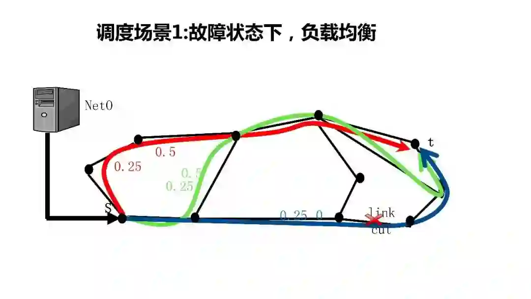 从第一个场景的图中可以看到三条链路在初始状态下进行数据的通信。通信链路出现单点故障时, NetO会把蓝色链路的流量动态的分配到其他两条链路上去。