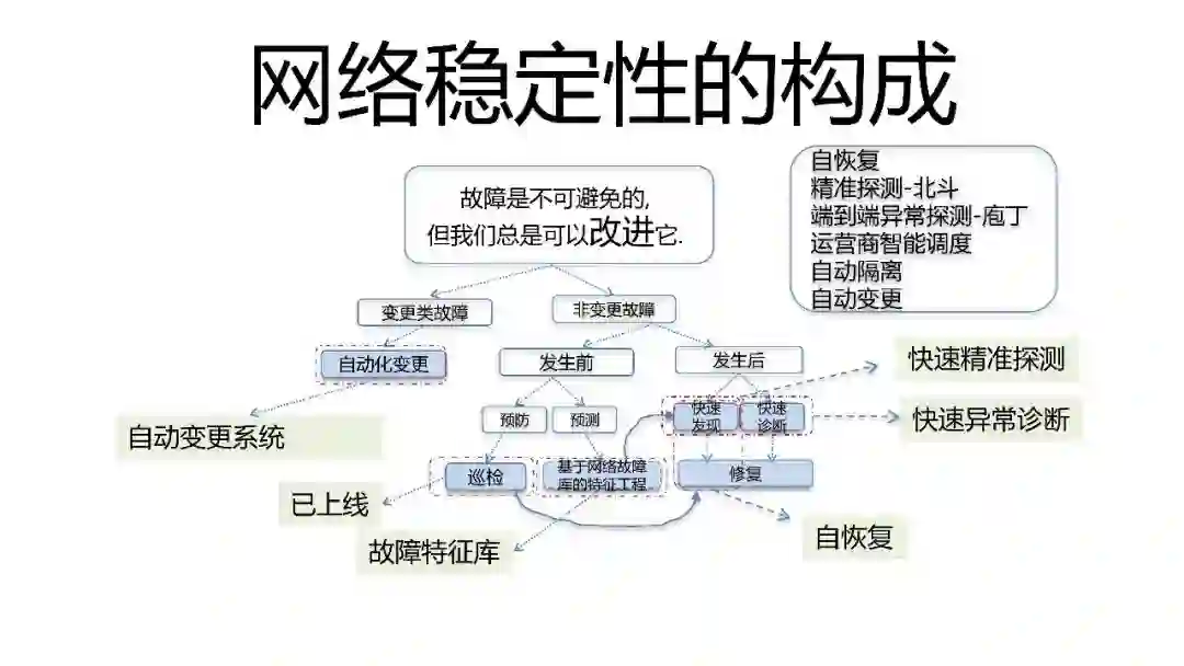 快速发现模块主要是用来提升精准探测能力,诊断模块用于提升端到端故障诊断速度。同时,我们也在积极构建整体网络故障特征库。通过分析历史网络故障体现的量化特征,精确描述故障的形态和量化特点,帮助我们预知未来网络的潜在的故障。巡检系统在过去一年已经稳定上线,自动化变更系统帮助我们很好的驾驭每一天面临的大量的变更需求。这些就是我们在解决网络稳定性方面的整体思路。