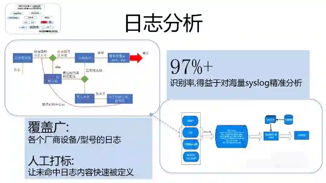 我们已经对海量实时日志有97%以上的识别率,每天处理数亿条平面日志,从日志中通过文本分析和积累,加上人工打标,覆盖了所有厂商日志型号。剩余3%也有经验丰富的网络工程师帮助我们进一步打标,完善知识库。这是日志分析的大概运作原理。