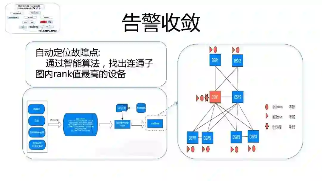当收敛出几十万条异常事件后,如何进一步确定异常的来源?我们将网络的拓扑加入在图计算引擎中。在对应一个时间窗口内,点亮所有产生告警信息的事件对应的拓扑图结构上。当连续一段拓扑被点亮后,把它当做一个故障联通子图,利用智能化算法对对应节点打分。通过rank值来确定出现故障设备源头。