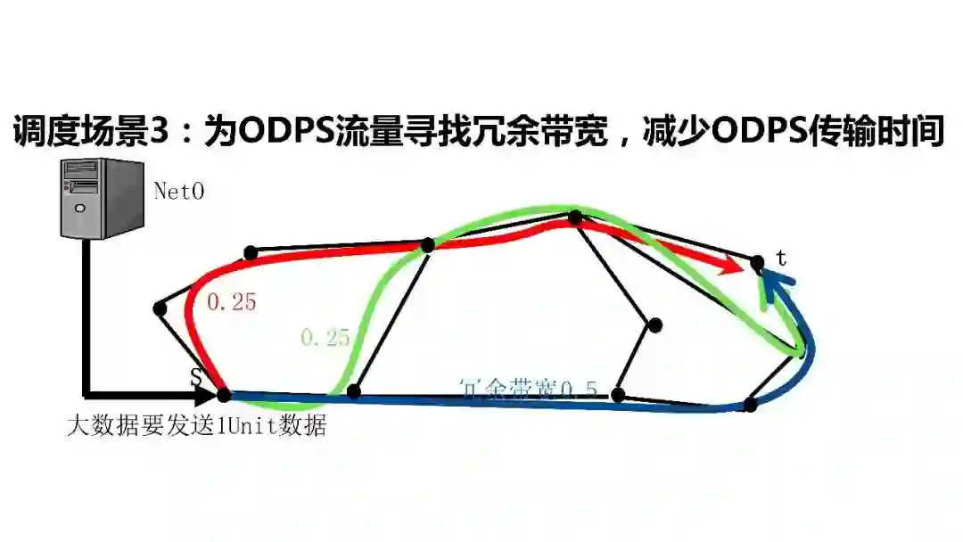 比如我们需要发送一个单位的数据,在初始状态下,以图中红绿两条链路发送数据时,由于带宽较小,需要两个时间周期完成数据的传输。NetO在整体链路上找到另外一条冗余带宽(蓝色链路),并提示系统把这个链路利用起来,这个调度过程触发了流量的再次优化分配。原本需要两个时间单位传输的数据在这条链路上一个时间单位就能完成。