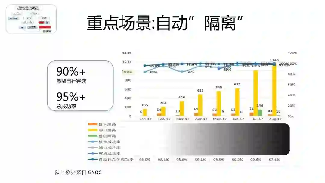 在自动隔离场景中,由于网络设备在运行过程中经常会出现故障,在快速修复之前前,隔离是在网络工程师解决问题的首要工作。从图中可以看出,自动隔离功能上线后,90%以上的隔离操作能自动完成,而且成功率高达95%,这样不仅省去了很多的人工还规避了很多潜在故障。