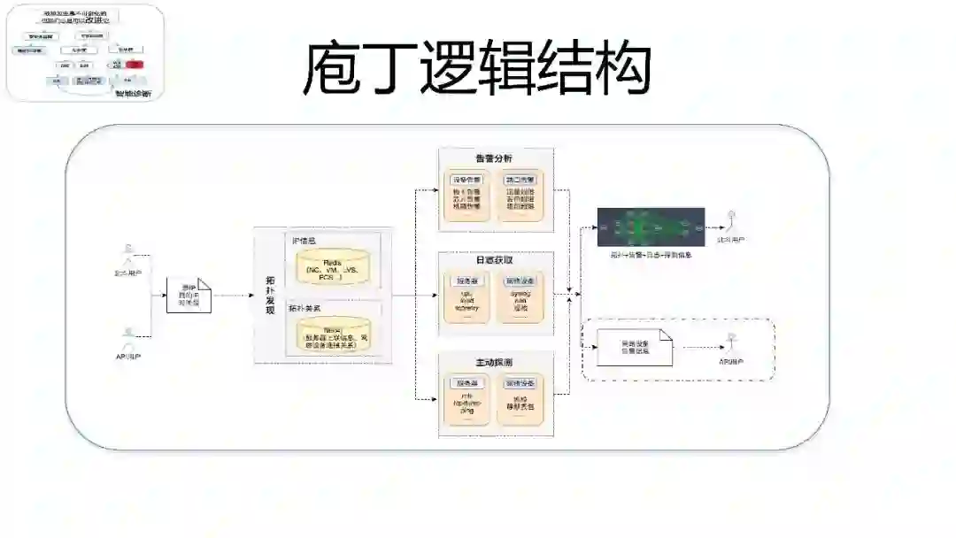 而庖丁可以同时进行网络拓扑发现、告警信息自动聚合分析、日志信息自动获取、命令工具自动下发这四项工作,把整个复杂问题的定位时长从1-2个小时缩减为3分钟,给各类场景带来极大的诊断效率提升。针对已经确定的两个点的IP,我们自动定义出所对应的IP拓扑是怎样一种结构;对相应拓扑链路上的所有日志进行实时提取、标注关键词;对可疑设备的告警进行自动化聚合收敛、过滤无效信息;主动对可疑设备进行可疑探测、做二次分析。这些过程几乎是一键完成。