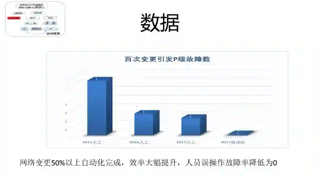 从图中可以看出,在2017年自动化变更上线后,变更引起的故障率有很大的降低,50%以上的变更实现了自动化,人员的误操作概率降为0。可想而知,变更的优化效率得到了很大的提升。