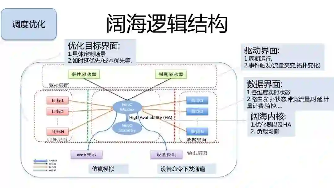 阔海有两种驱动方式,一是周期性运行;二是通过突事件触发,如拓扑发生变化、流量发生变化等。阔海一个数据平台,需要用各个维度的实时数据来进行现状态势感知,通过数据背后业务含义帮助我们制定最优化分配方案。这些方案完全可以按不同需求对成本、时延、带宽利用率组合定制场景。