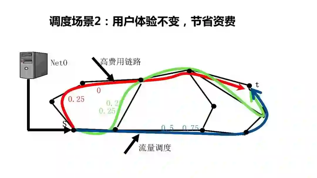 通过最优化流量分配来榨干多余带宽成本,同时满足最优路径选择、带宽扩容、稳定性方面的现实需求。