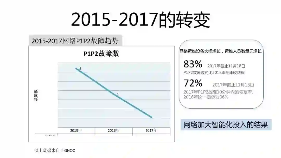 上图呈现的是我们在2015年之后在网络稳定性提升方面的具体数据。从这张图中可以看出,我们在15年到17年期间,稳定性得到了很好的优化。2017年P1 P2故障数对比2015年全年收敛了83%;P1 P2的故障数在十分钟内的恢复率对比2016年也得到了很好的改善。2016年在10分钟内的故障恢复率为38%,而在2017年则达到了72%。需要强调的一点是,阿里巴巴网络设备大幅度增长,而网络工程师和网络运维人员并无大幅度增长。这主要得益于过去两年我们在智能化上的投入。