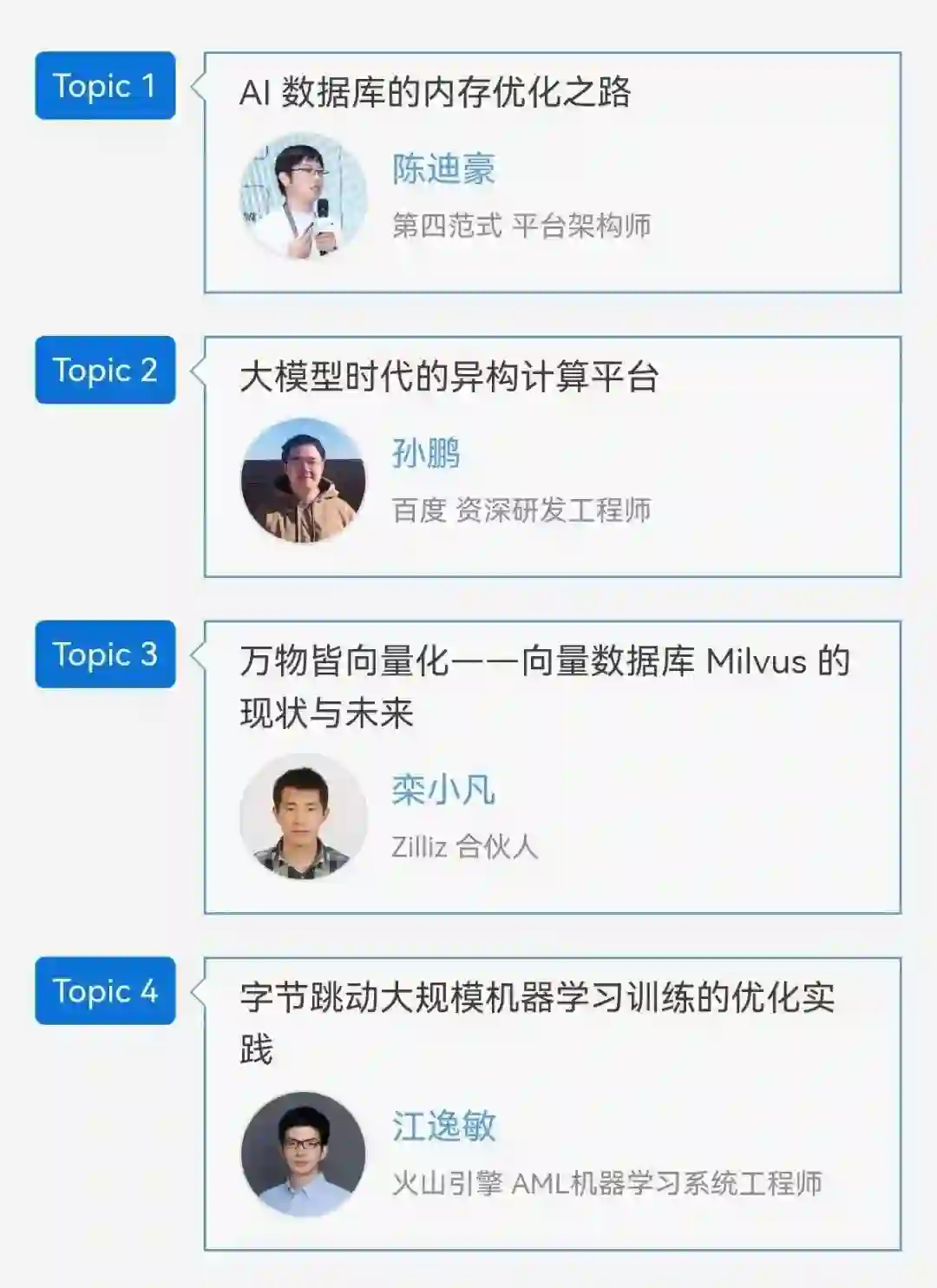 推荐理由: 为满足 AI 日益增大的强算力、高性能需求,AI 基础设施需要与时俱进。AI 数据库如何优化内存,提升计算性能?大模型时代,异构计算平台系统如何优化?向量数据库的使用场景有哪些?大规模机器学习中的通信如何加速?本专题将为你揭晓。