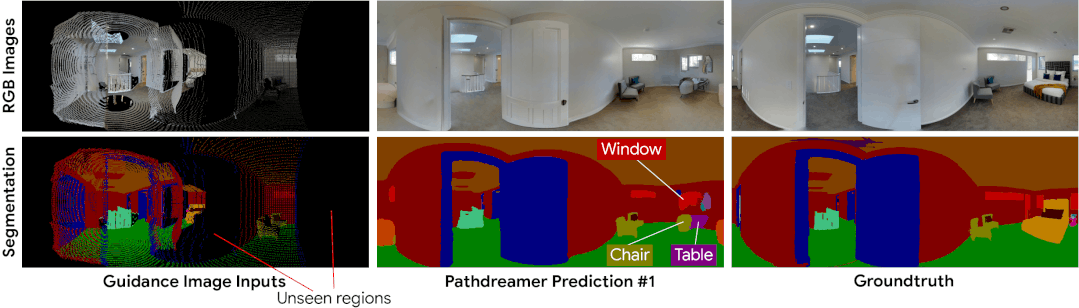 为预测新地点中的视觉观察结果,点云会首先在新地点以 2D 方式呈现,以便提供“指导”图像,Pathdreamer 可利用这些图像生成逼真的高分辨率 RGB、语义分割和深度图像。随着模型不断“移动”,新的观察结果(无论是真实或预测结果)均在点云中积累。使用点云作为记忆的一个优势在于时间一致性,再次访问的区域将以同一方式根据先前观察结果进行渲染。