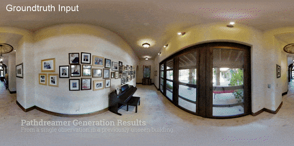 在发表于 ICCV 2021 上的“Pathdreamer:室内导航的世界模型 (Pathdreamer: A World Model for Indoor Navigation)”一文中,我们推出了一个世界模型,该模型使用非常有限的观察结果和拟定的导航轨迹,为建筑内智能体看不到的区域生成高分辨率 360º 视觉观察结果。如下方视频中所示,Pathdreamer 模型可以合成单个视角的沉浸式场景,预测智能体移动至新视野或完全陌生的区域(例如转角)的观察结果。除了可用于视频编辑和生成动态照片,解决此任务可以整理关于人类环境的信息,以便帮助机器智能体在现实环境中完成导航任务。例如,要查找特定房间或陌生环境中物体的机器人,可以使用此世界模型执行模拟,以便在实际执行搜索任务前识别物体可能出现的位置。Pathdreamer 这一类的世界模型还可通过在模型中训练智能体,提升训练数据量以供智能体使用。