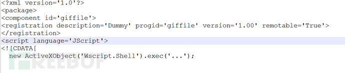 如果将COM 接口注册PSOAInterface或者PSDispatch后,oleaut32.dll 会查找注册的Type Library信息(存放在注册表中),如果找到的话,将调用LoadTypeLibrary 来加载 Type Library. TypeLibrary在加载的时候,有个很有趣的行为: 首先会按GUID查找,如果查找失败的话,会按文件名来查找。如果按文件名查找也失败的话,这时会按照Moniker 来查找。这时,我们只需将包含scriptlet的Moniker注入到一个Type Library 文件中。就可以执行这段scriptlet。漏洞发现者采用的ScriptLet如下图所示。