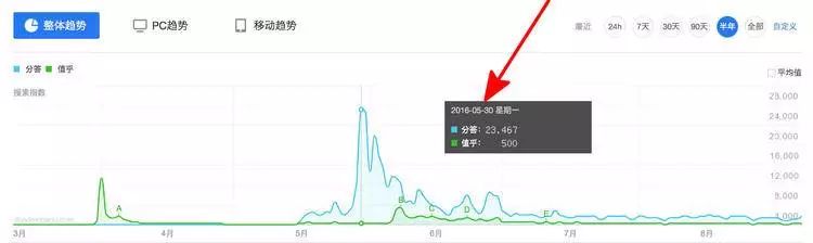 分答和值乎的百度指数,可以看到 5 月 30 日王思聪加入后,分答来到了历史最高点