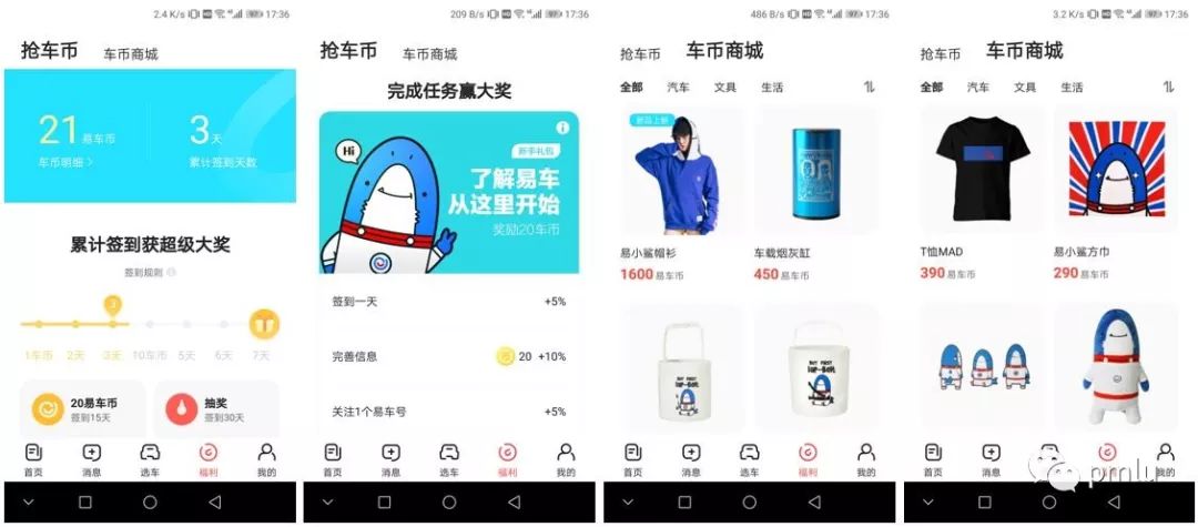 福利模块的构建大大增加了产品的可玩性以及用户粘性。福利模块分为两个部分,抢车币模块会给用户设置各种任务,易车商城模块用于用户完成任务获取车币的兑换。