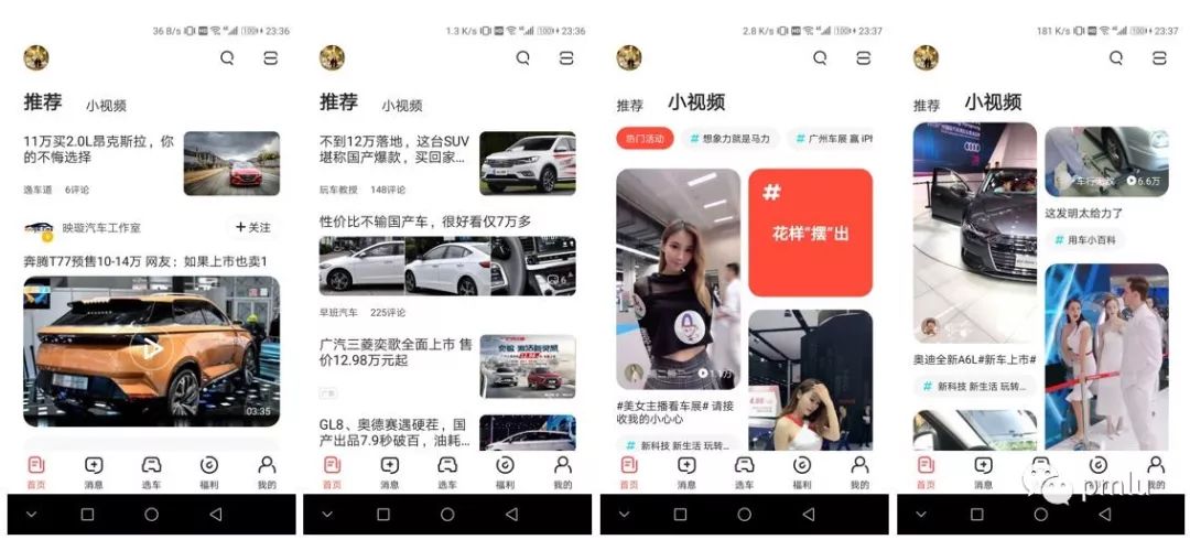 易车App的资讯模块是其传统强势项目,此次改版中顺应趋势的将小视频,直播等更受年轻人喜欢的内容进行了加强,让这两者与资讯模块并列,共同构建了易车App的首页内容。