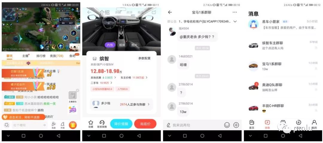 很多人可能没有接触过在线群聊功能,它直播间聊天(左一图)很相近。区别是一个关注主播,一个关注车型。群聊的位置在车型介绍的主页面,如左二图所示,点击参与热聊即可以加入群聊和关注该车的网友一起聊。