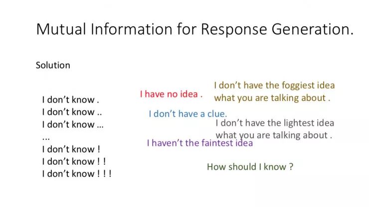 之前的这个模型,由于训练数据集里有很多无聊的回复,结果就是模型每次都会产生这种无聊的对话,比如说「我不知道」,「呵呵」之类的。但是光禁止机器回答这类无聊的问题是不够的,机器还会产生同类,同样意思的其他语句变种,例如下面这张图。