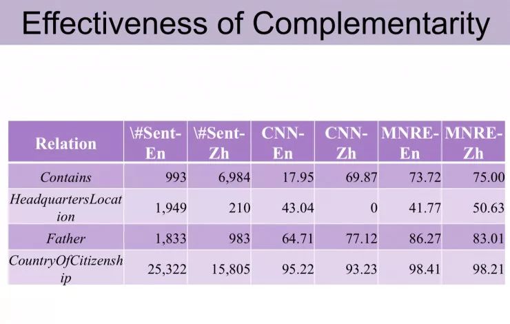 第二部分工作是关于知识抽取。我主要做的是文本关系抽取方面的工作。我们提出了多元的关系抽取系统,无论是在中文数据下或者在英文数据下,它抽取效果都比原始的有了非常大的提高。