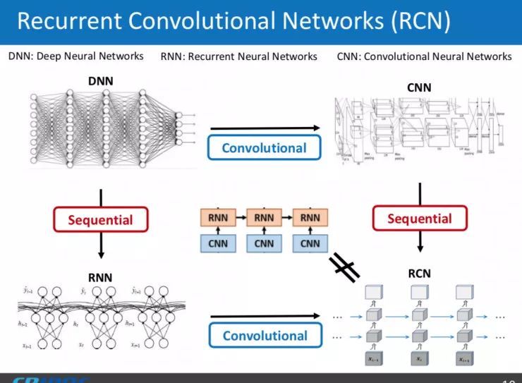 再来介绍一下循环卷积网络,它其实是一个全卷积的循环网络。以上图为例,对于传统的全连接深度神经网络,把它进行全卷积化,即把所有的全连接都替换成卷积操作,就得到我们经常使用的卷积网络。沿着时间方向展开,深度神经网络就变成一个循环网络。而我所介绍的循环卷积网络本质上是一个全卷积的循环网络。这种网络在参数量上有巨大优势,传统循环网络的参数量大概是在百万甚至千万左右,循环卷积网络基本上只有一两万左右,因此测试速度会得极大的提升。