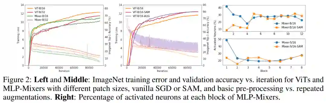 如图2(左)所示,使用SAM的ViT-B/16比使用vanilla SGD的训练误差更高。当在训练中使用强数据增强时,这种正则化效应也会发生,它迫使网络显式地学习RandAugment中的旋转平移等方差和mixup中的线性插值等先验。然而,增益对不同的训练设置很敏感(第5.2节),并导致高噪声损失曲线(图2(中间))。