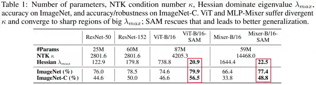 在表1中,通过计算主要的Hessian特征值 进一步验证了结果。ViT和MLP-Mixer的 值比ResNet大一个数量级,并且MLP-Mixer的曲率在3种中是最大的(具体分析见4.4节)。