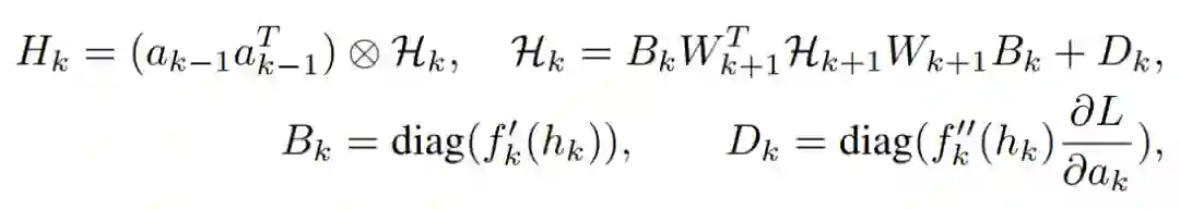 可以通过递归mlp的Hessian矩阵得到上述发现。设 和 分别为第k层激活前的值和激活后的值。它们满足,其中 为权值矩阵, 为激活函数(mlp-mixer中的GELU)。为了简单起见,在这里省略偏置项。Hessian矩阵 相对于 的对角块可递归计算为: